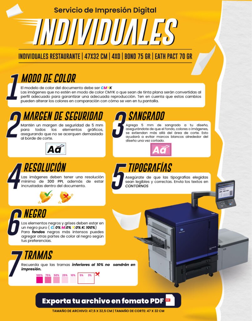 Individuales impresos a full color por una sola cara (4×0), en formato 47 × 32 cm. Diseñados para uso sobre mesas en restaurantes, cafés, hoteles o eventos gastronómicos.